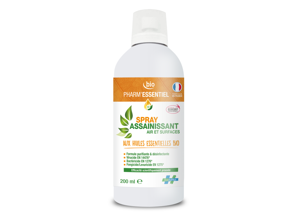 Pharm’Essentiel spray assainissant air et surfaces est une formule purifiante et désinfectante aux huiles essentielles Bio.