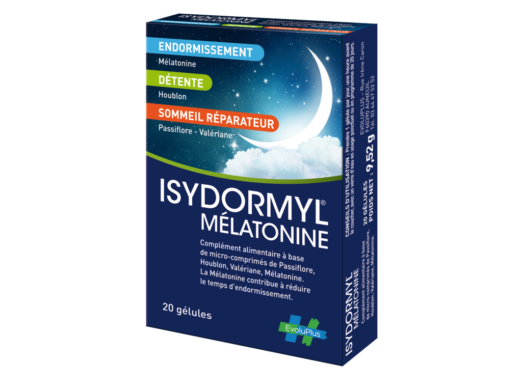 Isydormyl® Mélatonine est un complément alimentaire. Ne pas dépasser la dose journalière recommandée. Les compléments alimentaires ne peuvent être utilisés comme substituts d’un régime alimentaire varié et équilibré et d’un mode de vie sain. Pour votre santé, mangez 5 fruits ou légumes par jour. www.mangerbouger.fr