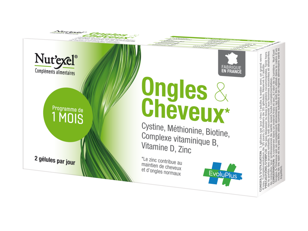 Nut'Exel® Ongles & Cheveux est un complément alimentaire. Ne pas dépasser la dose journalière recommandée. Les compléments alimentaires ne peuvent être utilisés comme substituts d’un régime alimentaire varié et équilibré et d’un mode de vie sain. Pour votre santé, mangez 5 fruits ou légumes par jour. www.mangerbouger.fr