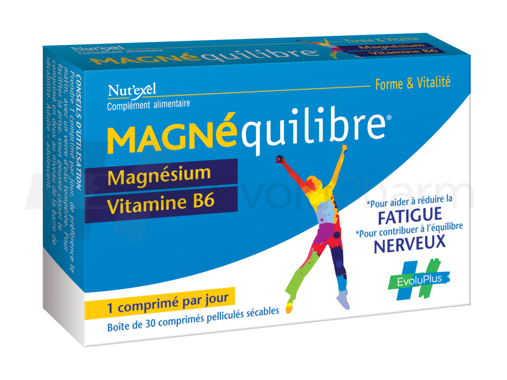 Magnéquilibre® B6 est un complément alimentaire. Ne pas dépasser la dose journalière recommandée. Les compléments alimentaires ne peuvent être utilisés comme substituts d’un régime alimentaire varié et équilibré et d’un mode de vie sain. Pour votre santé, mangez 5 fruits ou légumes par jour. www.mangerbouger.fr