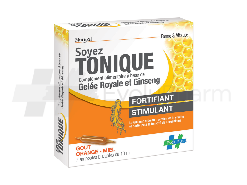 Soyez Tonique est un complément alimentaire à base de Gelée Royale et Ginseng, goût Orange - Miel.