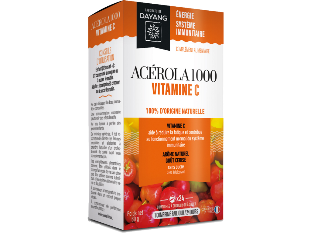 Acérola 1000 24 comprimés est un complément alimentaire. Ne pas dépasser la dose journalière recommandée. Les compléments alimentaires ne peuvent être utilisés comme substituts d’un régime alimentaire varié et équilibré et d’un mode de vie sain. Pour votre santé, mangez 5 fruits ou légumes par jour. www.mangerbouger.fr
