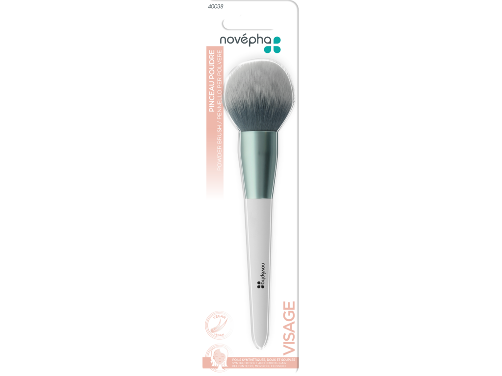 - Pinceau arrondi aux poils synthétiques, doux et souples pour poudre libre ou compacte.