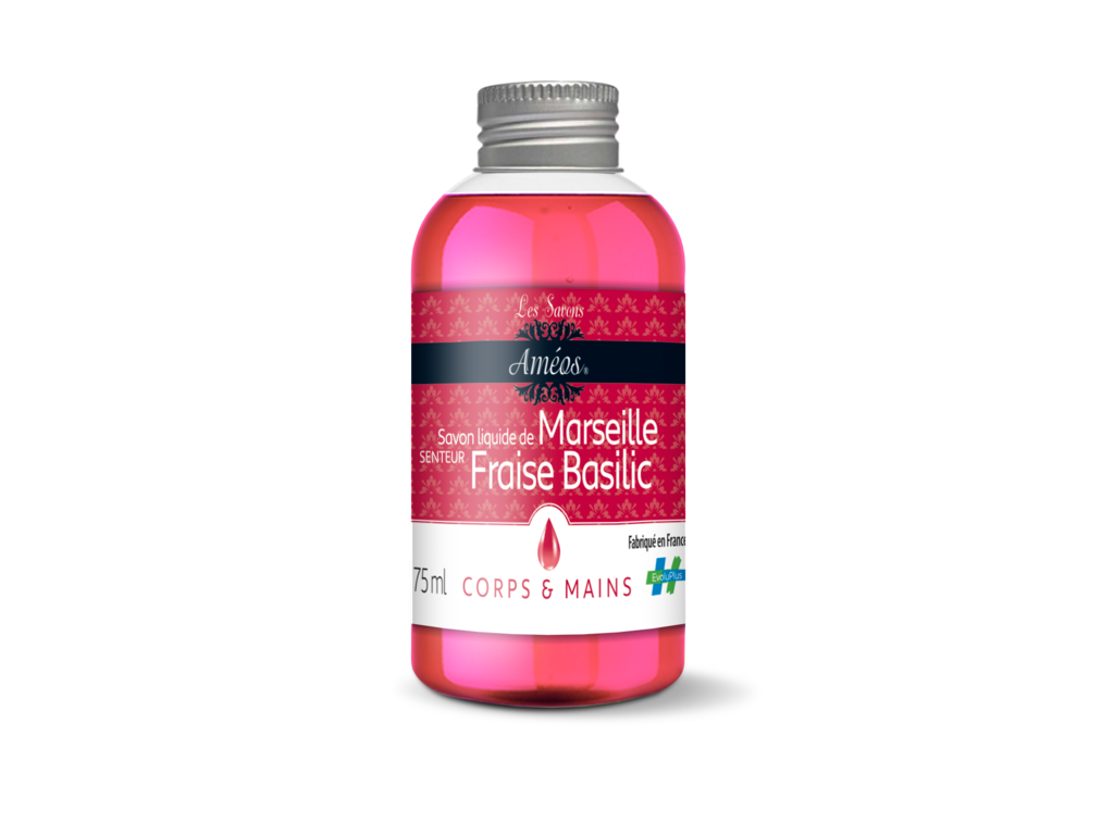 Améos® Savon liquide de Marseille Fraise Basilic 75 ml est un produit cosmétique à usage externe. Lire les informations figurant sur les produits avant utilisation.