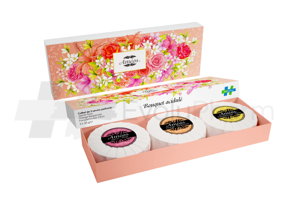 Améos coffret acidulé 3 savons de 50g est un produit cosmétique à usage externe. Lire les informations figurant sur les produits avant utilisation.